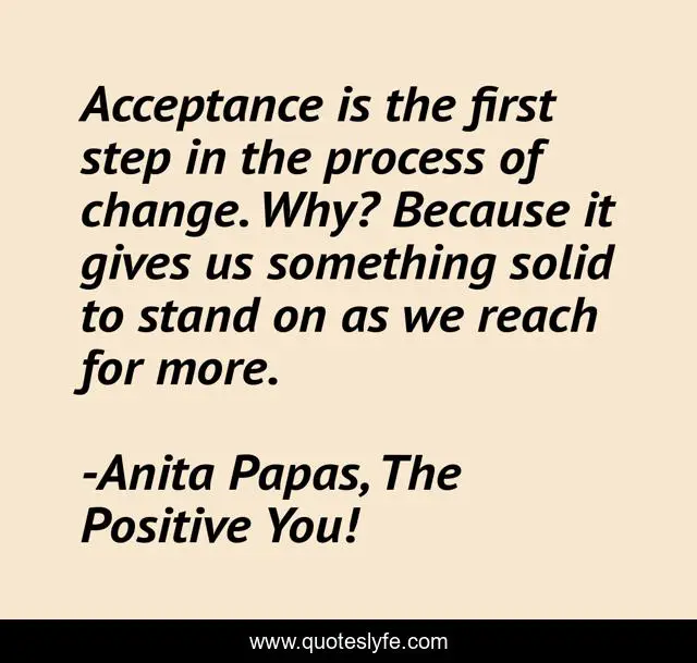 This page presents the quote "Acceptance is the first step in the process of change. Why? Because it gives us something solid to stand on as we reach for more.". Author of this quote is Anita Papas, The Positive You!. This quote is about confidence, positive, positivity, motivational, positive-thinking, self-improvement, inspirational, self-help, positive-thoughts,.