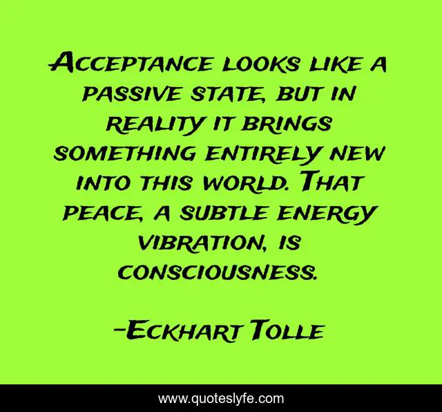 This page presents the quote "Acceptance looks like a passive state, but in reality it brings something entirely new into this world. That peace, a subtle energy vibration, is consciousness.". Author of this quote is Eckhart Tolle. This quote is about world, acceptance, reality,.