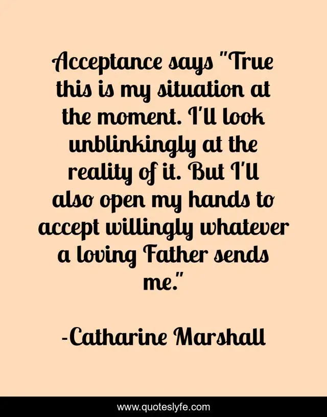 This page presents the quote "Acceptance says "True this is my situation at the moment. I'll look unblinkingly at the reality of it. But I'll also open my hands to accept willingly whatever a loving Father sends me."". Author of this quote is Catharine Marshall. .