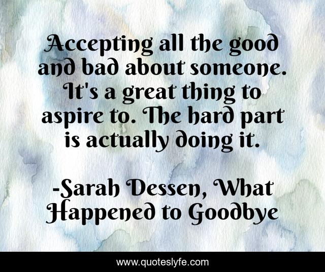This page presents the quote "Accepting all the good and bad about someone. It's a great thing to aspire to. The hard part is actually doing it.". Author of this quote is Sarah Dessen, What Happened to Goodbye. This quote is about acceptance, tolerance, understanding-others,.