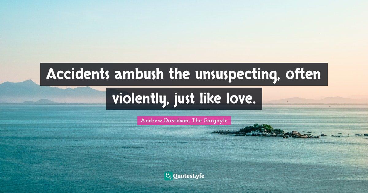 This page presents the quote "Accidents ambush the unsuspecting, often violently, just like love.". Author of this quote is Andrew Davidson, The Gargoyle. This quote is about unsuspecting, accident, love, affection,.