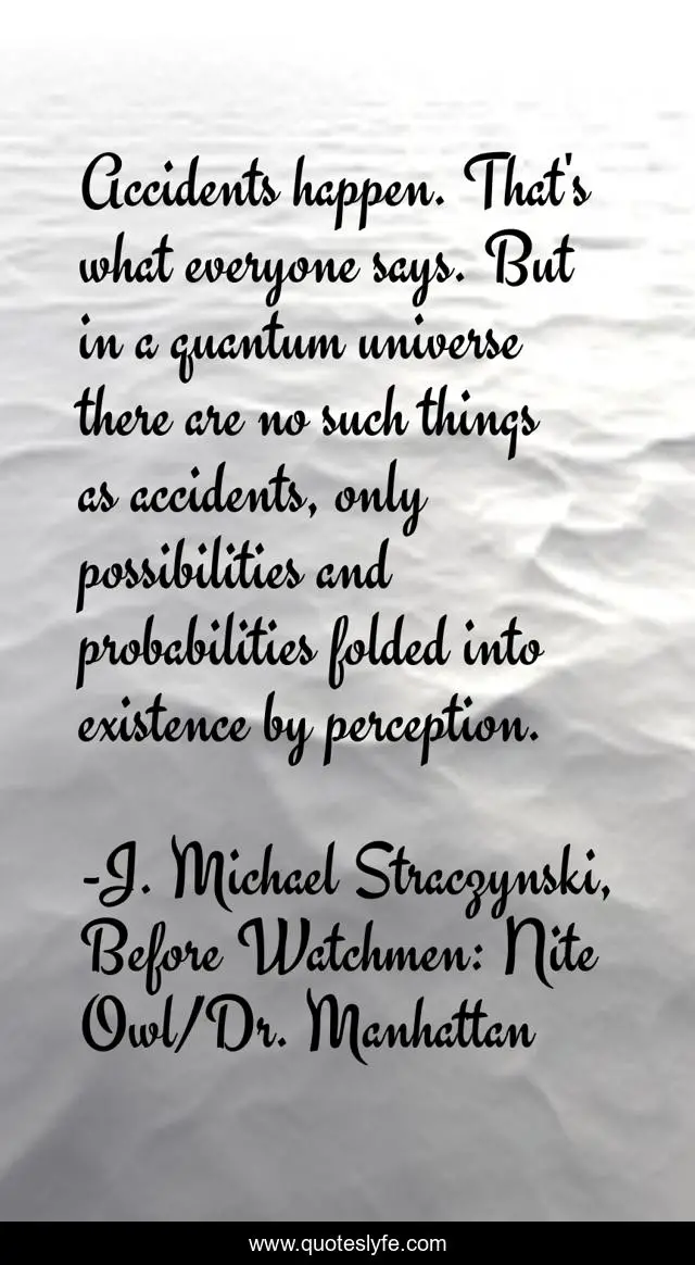 This page presents the quote "Accidents happen. That's what everyone says. But in a quantum universe there are no such things as accidents, only possibilities and probabilities folded into existence by perception.". Author of this quote is J. Michael Straczynski, Before Watchmen: Nite Owl/Dr. Manhattan. This quote is about quantum-universe, perception, probability, dr-manhattan, schrödinger, accidents, 2013,.