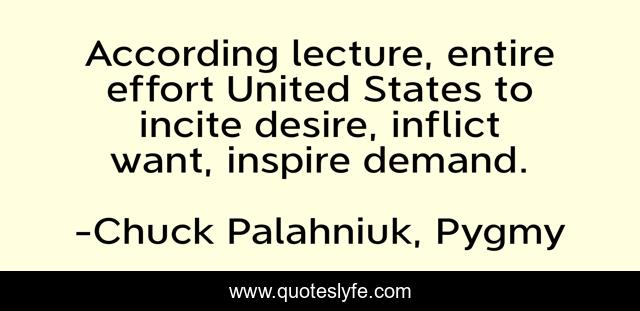 This page presents the quote "According lecture, entire effort United States to incite desire, inflict want, inspire demand.". Author of this quote is Chuck Palahniuk, Pygmy. This quote is about wanting, consumerism, american-society, america,.