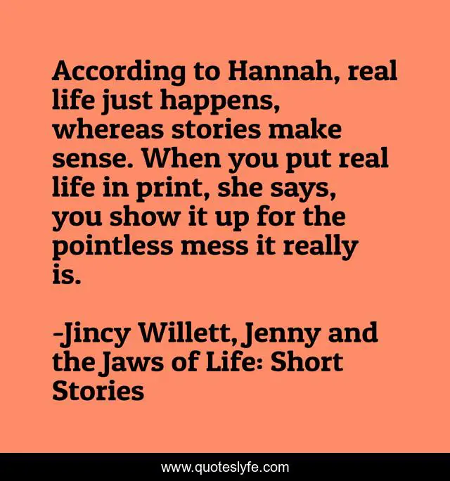 This page presents the quote "According to Hannah, real life just happens, whereas stories make sense. When you put real life in print, she says, you show it up for the pointless mess it really is.". Author of this quote is Jincy Willett, Jenny and the Jaws of Life: Short Stories. This quote is about life, stories,.