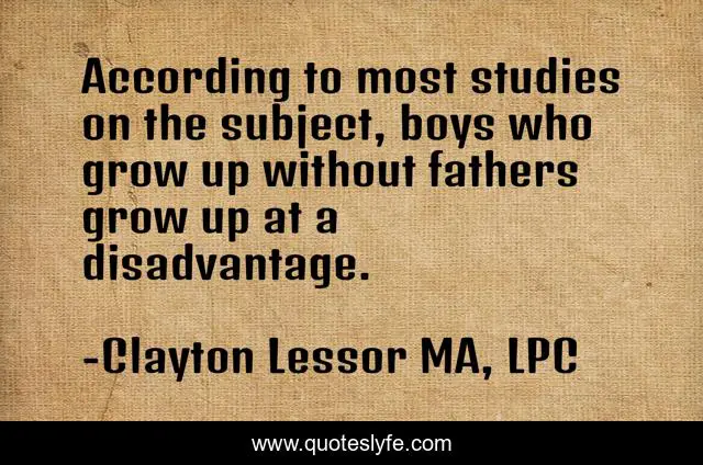 This page presents the quote "According to most studies on the subject, boys who grow up without fathers grow up at a disadvantage.". Author of this quote is Clayton Lessor MA, LPC. This quote is about discipline, boy, childhood, parenthood, parent, family, motherhood, mentor, mother,.