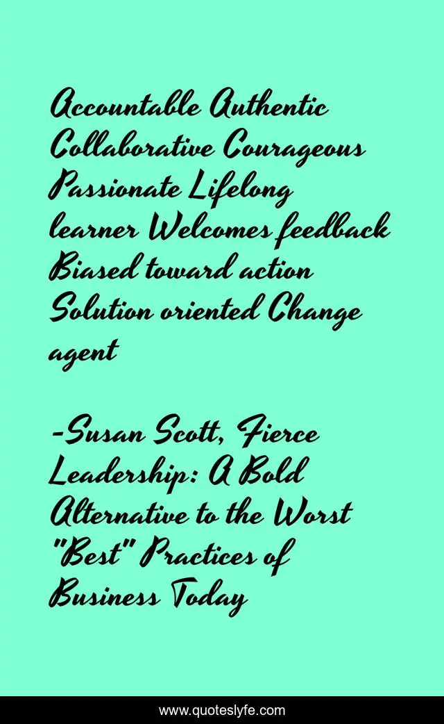 "Susan Scott, Fierce Leadership: A Bold Alternative to the Worst "Best" Practices of Business Today Quotes." Quoteslyfe.com, 2025. Fri. 05 Dec. 2025. <https://www.quoteslyfe.com/quote/Accountable-Authentic-Collaborative-Courageous-Passionate-Lifelong-learner-218776>.