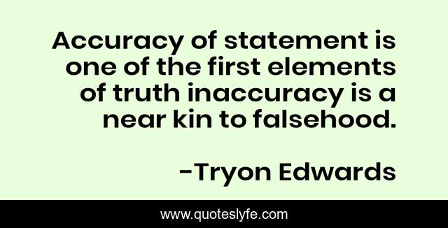 This page presents the quote "Accuracy of statement is one of the first elements of truth inaccuracy is a near kin to falsehood.". Author of this quote is Tryon Edwards. This quote is about elements, first, accuracy,.