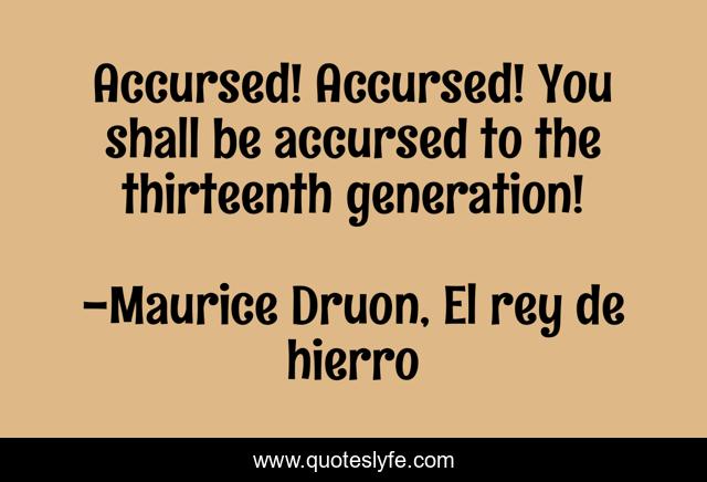 This page presents the quote "Accursed! Accursed! You shall be accursed to the thirteenth generation!". Author of this quote is Maurice Druon, El rey de hierro. This quote is about be, maurice, druon, iron, the, accursed, king,.