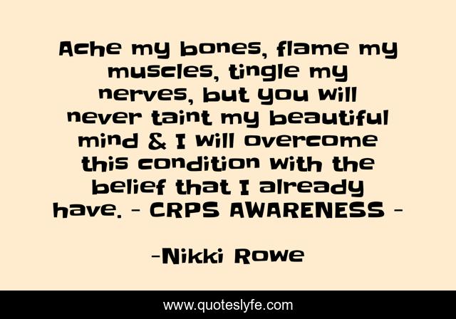 This page presents the quote "Ache my bones, flame my muscles, tingle my nerves, but you will never taint my beautiful mind & I will overcome this condition with the belief that I already have. - CRPS AWARENESS -". Author of this quote is Nikki Rowe. This quote is about self-heal, inspiring, heal, writer, powerful, cure, crps, self-help, healer,.