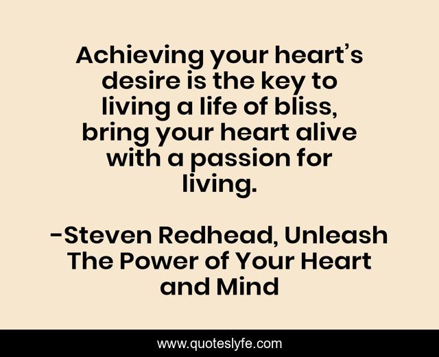 This page presents the quote "Achieving your heart’s desire is the key to living a life of bliss, bring your heart alive with a passion for living.". Author of this quote is Steven Redhead, Unleash The Power of Your Heart and Mind. This quote is about desire, heart, life, passion, bliss,.