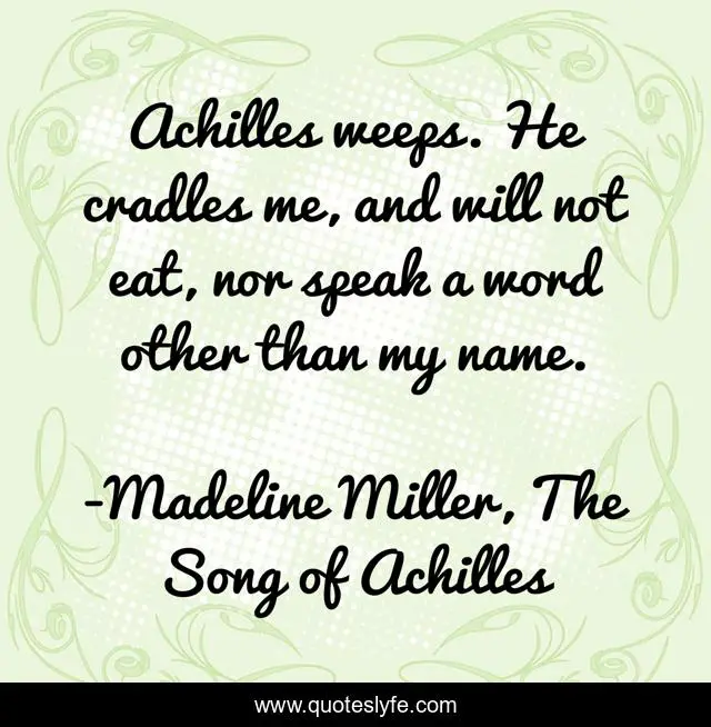 This page presents the quote "Achilles weeps. He cradles me, and will not eat, nor speak a word other than my name.". Author of this quote is Madeline Miller, The Song of Achilles. This quote is about name, patroclus, dead, weeping, achilles, patrochilles,.