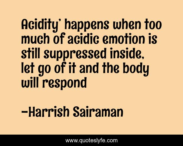 This page presents the quote "Acidity’ happens when too much of acidic emotion is still suppressed inside, let go of it and the body will respond". Author of this quote is Harrish Sairaman. This quote is about body, emotion, let-go, acidity,.