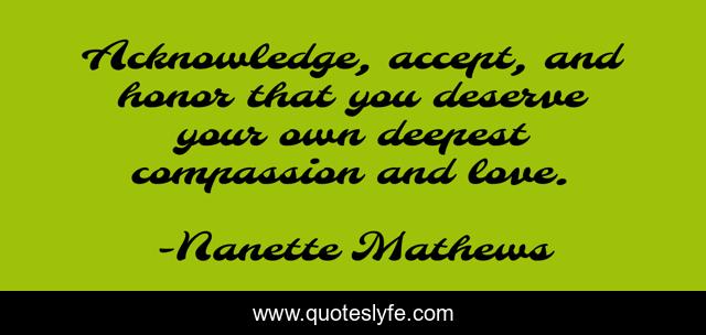 This page presents the quote "Acknowledge, accept, and honor that you deserve your own deepest compassion and love.". Author of this quote is Nanette Mathews. This quote is about self-love, self-worth, inspirational, enthusiasm, self-care, self-esteem,.