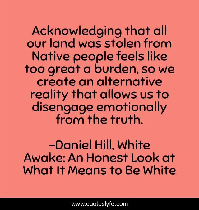 This page presents the quote "Acknowledging that all our land was stolen from Native people feels like too great a burden, so we create an alternative reality that allows us to disengage emotionally from the truth.". Author of this quote is Daniel Hill, White Awake: An Honest Look at What It Means to Be White. This quote is about race-and-racism-in-america, american-history, history, reconciliation, race-relations,.