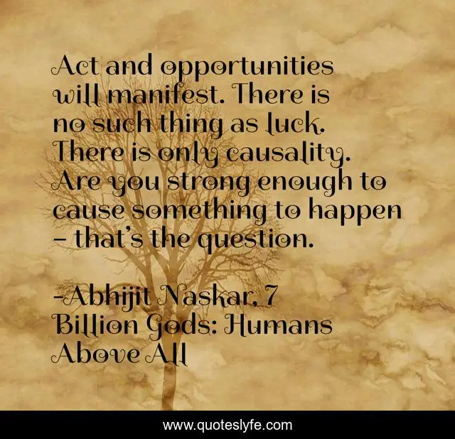 This page presents the quote "Act and opportunities will manifest. There is no such thing as luck. There is only causality. Are you strong enough to cause something to happen – that’s the question.". Author of this quote is Abhijit Naskar, 7 Billion Gods: Humans Above All. This quote is about courage, confidence, brainy, causality, human-efforts, motivational, pursuit-of-your-dreams, pursuit-of-goal, inspirational,.