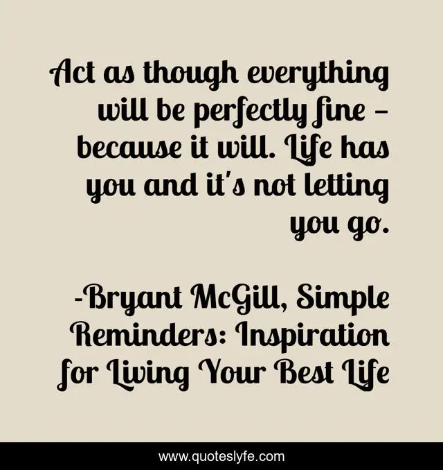 This page presents the quote "Act as though everything will be perfectly fine — because it will. Life has you and it's not letting you go.". Author of this quote is Bryant McGill, Simple Reminders: Inspiration for Living Your Best Life. This quote is about faith, acting, growth, surrender,.
