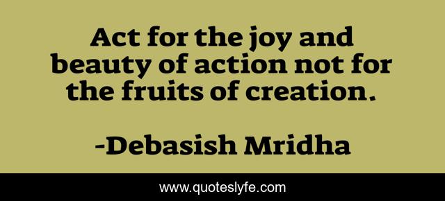 This page presents the quote "Act for the joy and beauty of action not for the fruits of creation.". Author of this quote is Debasish Mridha. This quote is about creation, beauty, joy, philosophy, debasish-mridha, debasish-mridha-m-d, quotes, fruits-of-creation, inspirational,.