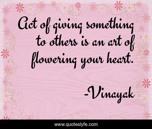 This page presents the quote "Act of giving something to others is an art of flowering your heart.". Author of this quote is Vinayak. This quote is about heart, flower, art,.