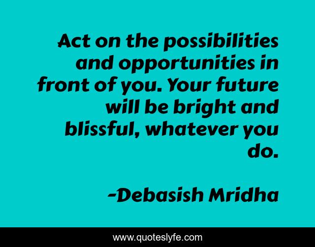 This page presents the quote "Act on the possibilities and opportunities in front of you. Your future will be bright and blissful, whatever you do.". Author of this quote is Debasish Mridha. This quote is about life, love, knowledge, inspirational, intelligence, philosophy, wisdom, quotes, affection,.
