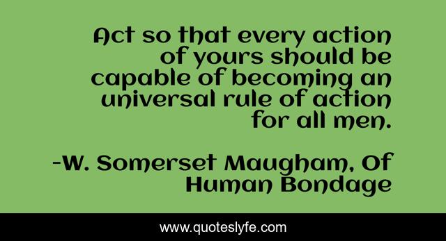 This page presents the quote "Act so that every action of yours should be capable of becoming an universal rule of action for all men.". Author of this quote is W. Somerset Maugham, Of Human Bondage. .