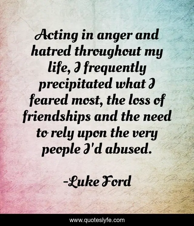 This page presents the quote "Acting in anger and hatred throughout my life, I frequently precipitated what I feared most, the loss of friendships and the need to rely upon the very people I'd abused.". Author of this quote is Luke Ford. This quote is about loss, life, people,.