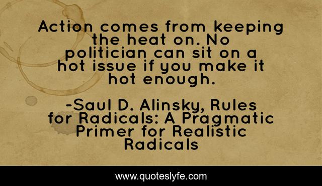 This page presents the quote "Action comes from keeping the heat on. No politician can sit on a hot issue if you make it hot enough.". Author of this quote is Saul D. Alinsky, Rules for Radicals: A Pragmatic Primer for Realistic Radicals. This quote is about politics, activism,.