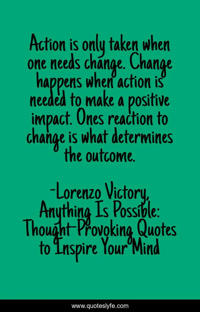 This page presents the quote "Action is only taken when one needs change. Change happens when action is needed to make a positive impact. Ones reaction to change is what determines the outcome.". Author of this quote is Lorenzo Victory, Anything Is Possible: Thought-Provoking Quotes to Inspire Your Mind. This quote is about confidence, power, positive, inspiritional, behaviour, attitude, kindness, think,.