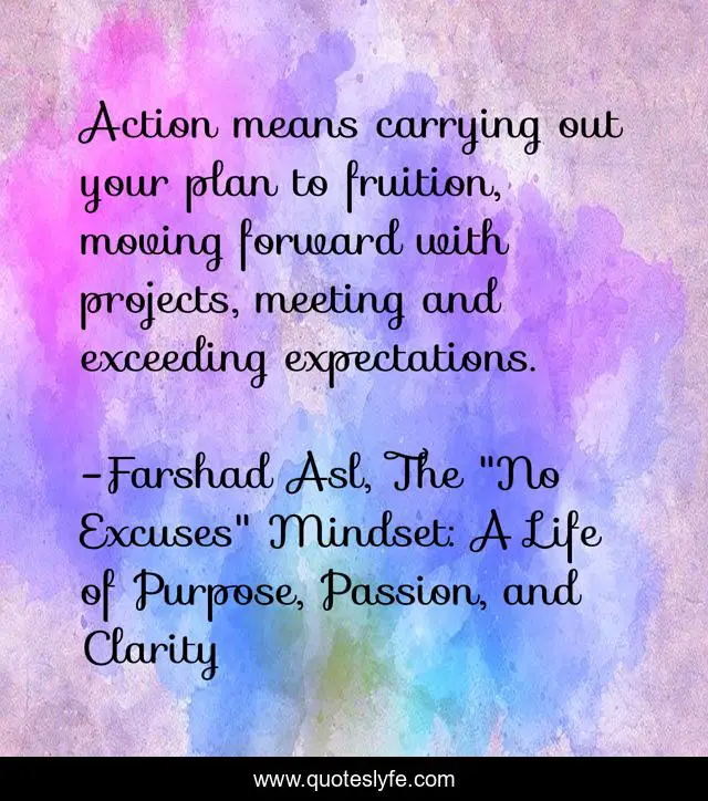 This page presents the quote "Action means carrying out your plan to fruition, moving forward with projects, meeting and exceeding expectations.". Author of this quote is Farshad Asl, The "No Excuses" Mindset: A Life of Purpose, Passion, and Clarity. This quote is about action, expectations, plan,.