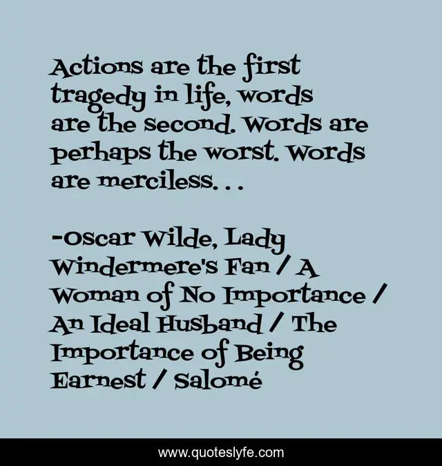 This page presents the quote "Actions are the first tragedy in life, words are the second. Words are perhaps the worst. Words are merciless. . .". Author of this quote is Oscar Wilde, Lady Windermere's Fan / A Woman of No Importance / An Ideal Husband / The Importance of Being Earnest / Salomé. This quote is about action, tragedy, words,.