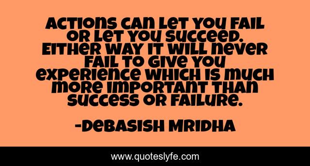 This page presents the quote "Actions can let you fail or let you succeed. Either way it will never fail to give you experience which is much more important than success or failure.". Author of this quote is Debasish Mridha. This quote is about success, debasish-mridha, how-to-fail, philosophy, failure-leads-to-success, success-or-failure, quotes, debasish-mridha-md, inspirational,.