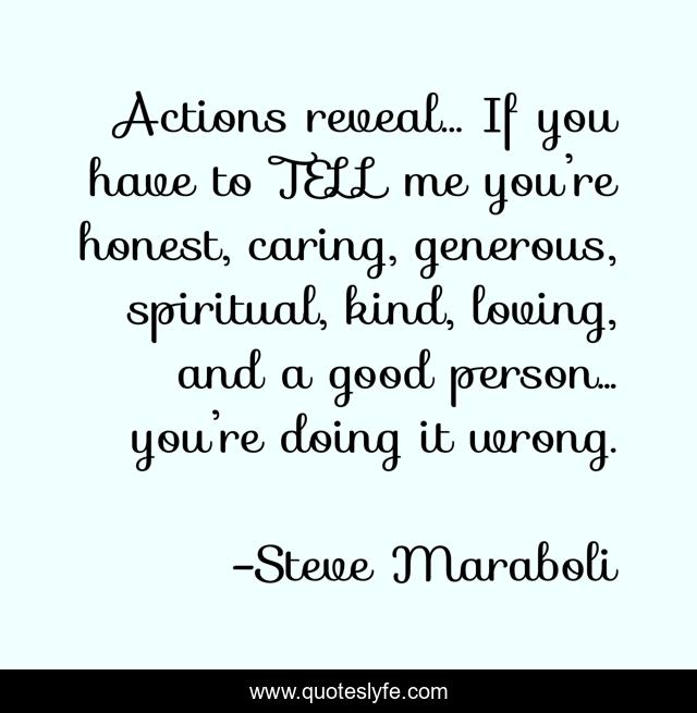This page presents the quote "Actions reveal… If you have to TELL me you’re honest, caring, generous, spiritual, kind, loving, and a good person... you’re doing it wrong.". Author of this quote is Steve Maraboli. This quote is about caring, life, love, honesty, spiritual, generous, actions, truth, kindness,.
