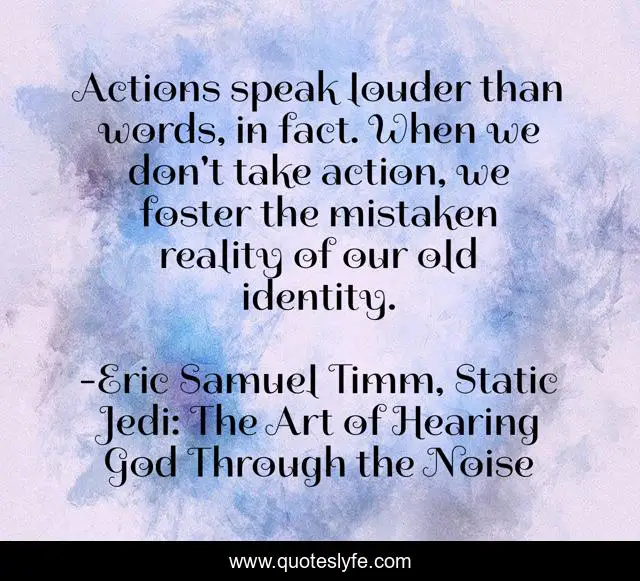 This page presents the quote "Actions speak louder than words, in fact. When we don't take action, we foster the mistaken reality of our old identity.". Author of this quote is Eric Samuel Timm, Static Jedi: The Art of Hearing God Through the Noise. This quote is about art, old, artist, god, reality, jedi, foster, static, action,.