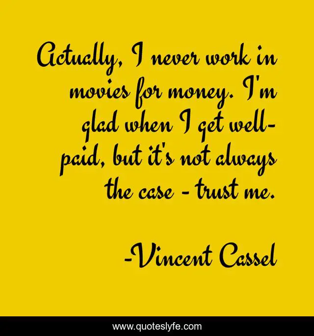 This page presents the quote "Actually, I never work in movies for money. I'm glad when I get well-paid, but it's not always the case - trust me.". Author of this quote is Vincent Cassel. This quote is about me, money, work,.
