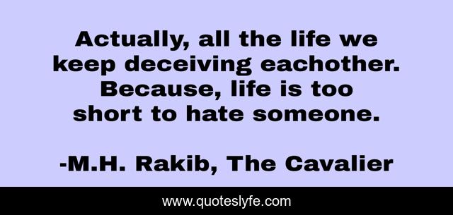 This page presents the quote "Actually, all the life we keep deceiving eachother. Because, life is too short to hate someone.". Author of this quote is M.H. Rakib, The Cavalier. This quote is about life, deception, modrenism, quote, community, social-life, hate,.