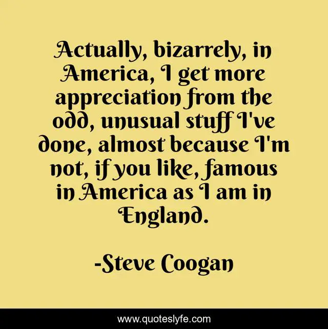 This page presents the quote "Actually, bizarrely, in America, I get more appreciation from the odd, unusual stuff I've done, almost because I'm not, if you like, famous in America as I am in England.". Author of this quote is Steve Coogan. This quote is about appreciation, america,.