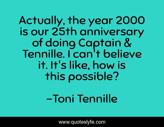 This page presents the quote "Actually, the year 2000 is our 25th anniversary of doing Captain & Tennille. I can't believe it. It's like, how is this possible?". Author of this quote is Toni Tennille. This quote is about believe, captain,.