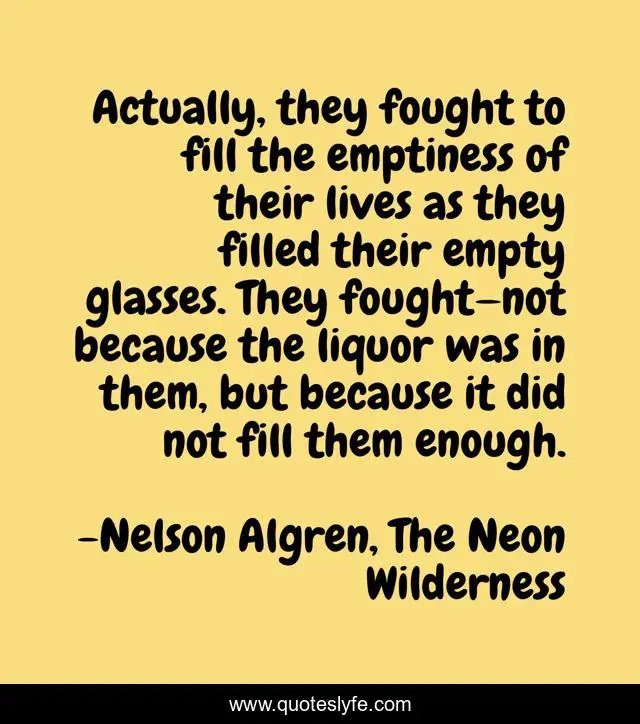 This page presents the quote "Actually, they fought to fill the emptiness of their lives as they filled their empty glasses. They fought—not because the liquor was in them, but because it did not fill them enough.". Author of this quote is Nelson Algren, The Neon Wilderness. This quote is about drinking, emptiness, fighting, chicago,.