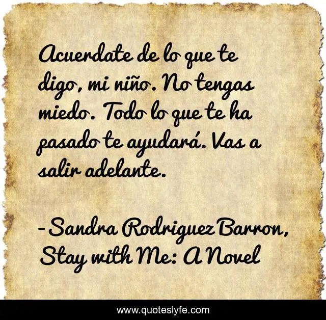This page presents the quote "Acuerdate de lo que te digo, mi niño. No tengas miedo. Todo lo que te ha pasado te ayudará. Vas a salir adelante.". Author of this quote is Sandra Rodriguez Barron, Stay with Me: A Novel. This quote is about faith, bravery, perseverance,.