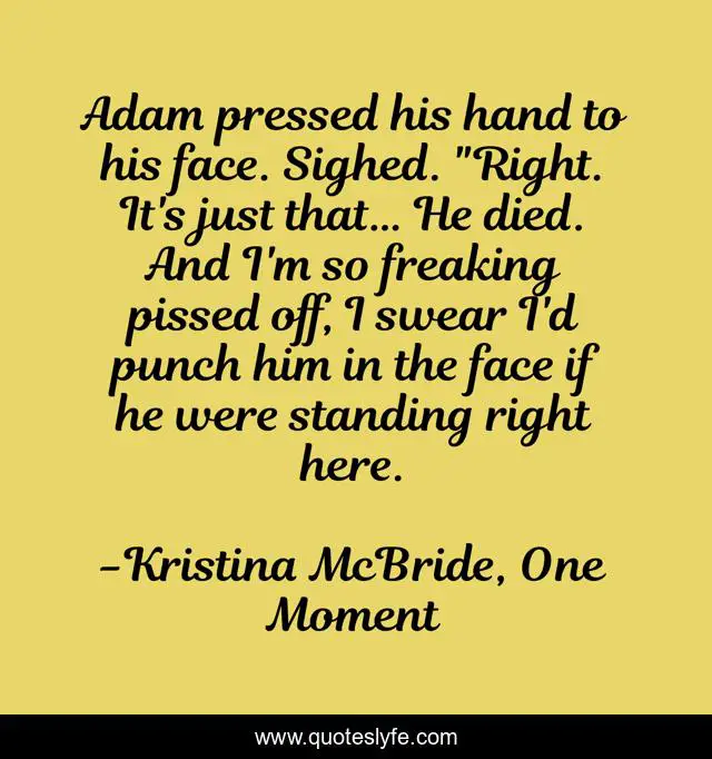 This page presents the quote "Adam pressed his hand to his face. Sighed. "Right. It's just that… He died. And I'm so freaking pissed off, I swear I'd punch him in the face if he were standing right here.". Author of this quote is Kristina McBride, One Moment. This quote is about funny, death, humor, humour, grief, comedy,.