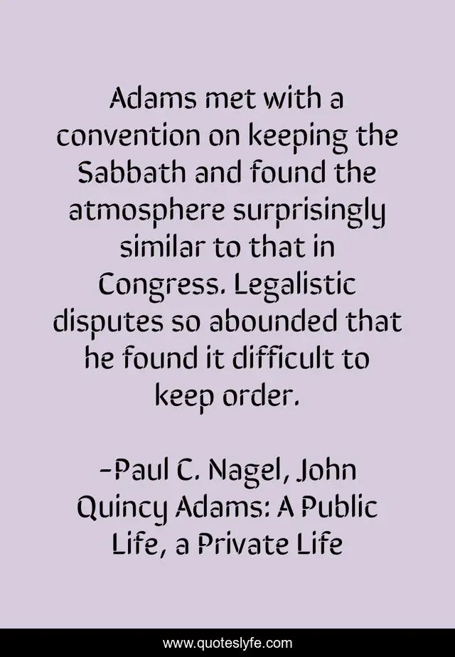 This page presents the quote "Adams met with a convention on keeping the Sabbath and found the atmosphere surprisingly similar to that in Congress. Legalistic disputes so abounded that he found it difficult to keep order.". Author of this quote is Paul C. Nagel, John Quincy Adams: A Public Life, a Private Life. This quote is about division, community,.