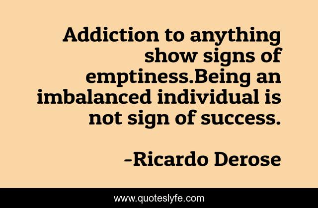This page presents the quote "Addiction to anything show signs of emptiness.Being an imbalanced individual is not sign of success.". Author of this quote is Ricardo Derose. This quote is about balance, unbalanced,.