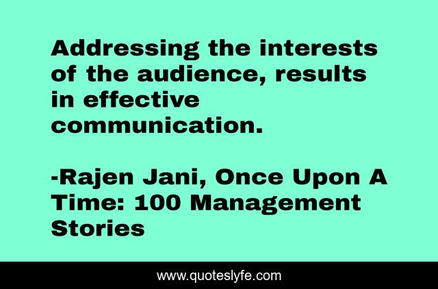 This page presents the quote "Addressing the interests of the audience, results in effective communication.". Author of this quote is Rajen Jani, Once Upon A Time: 100 Management Stories. This quote is about motivation, communication, sales, anger, improvement, quality, management, knowledge, strategy,.