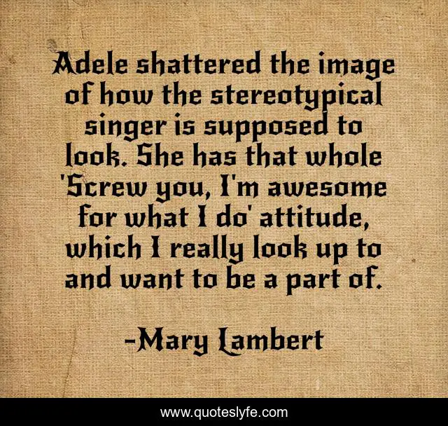 This page presents the quote "Adele shattered the image of how the stereotypical singer is supposed to look. She has that whole 'Screw you, I'm awesome for what I do' attitude, which I really look up to and want to be a part of.". Author of this quote is Mary Lambert. .
