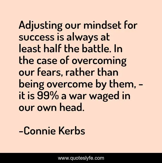 This page presents the quote "Adjusting our mindset for success is always at least half the battle. In the case of overcoming our fears, rather than being overcome by them, - it is 99% a war waged in our own head.". Author of this quote is Connie Kerbs. This quote is about overcoming-fear, success, mindset,.