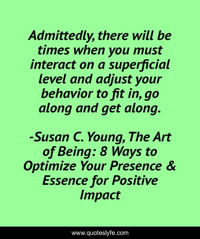 This page presents the quote "Admittedly, there will be times when you must interact on a superficial level and adjust your behavior to fit in, go along and get along.". Author of this quote is Susan C. Young, The Art of Being: 8 Ways to Optimize Your Presence & Essence for Positive Impact. This quote is about social-networking, susan-young, relationship, communication-skills, communication, personality-development, first-impressions, authenticity, trust,.