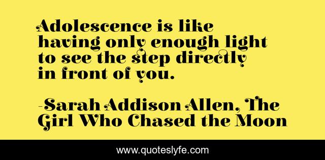 This page presents the quote "Adolescence is like having only enough light to see the step directly in front of you.". Author of this quote is Sarah Addison Allen, The Girl Who Chased the Moon. This quote is about youth, adolescence,.