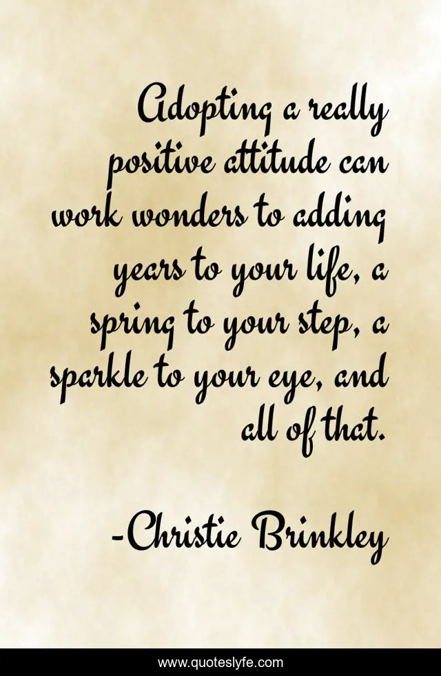 This page presents the quote "Adopting a really positive attitude can work wonders to adding years to your life, a spring to your step, a sparkle to your eye, and all of that.". Author of this quote is Christie Brinkley. This quote is about positive, life, work, confidence,.