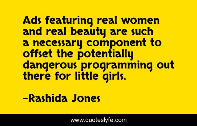 This page presents the quote "Ads featuring real women and real beauty are such a necessary component to offset the potentially dangerous programming out there for little girls.". Author of this quote is Rashida Jones. This quote is about real, little girls, women,.