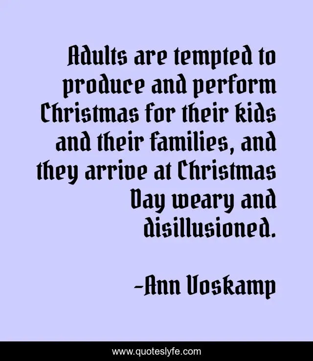 This page presents the quote "Adults are tempted to produce and perform Christmas for their kids and their families, and they arrive at Christmas Day weary and disillusioned.". Author of this quote is Ann Voskamp. This quote is about kids, day, weary,.