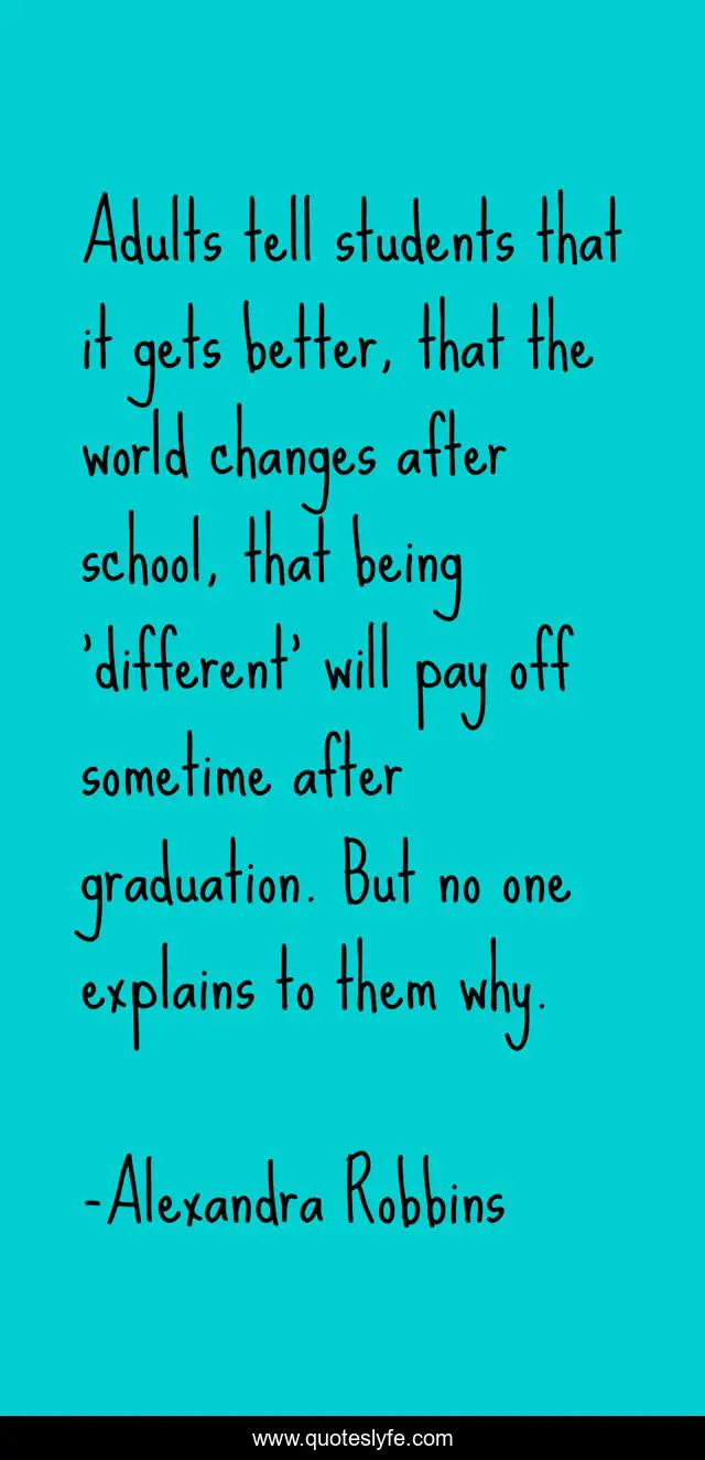 This page presents the quote "Adults tell students that it gets better, that the world changes after school, that being 'different' will pay off sometime after graduation. But no one explains to them why.". Author of this quote is Alexandra Robbins. This quote is about world, school, changes,.